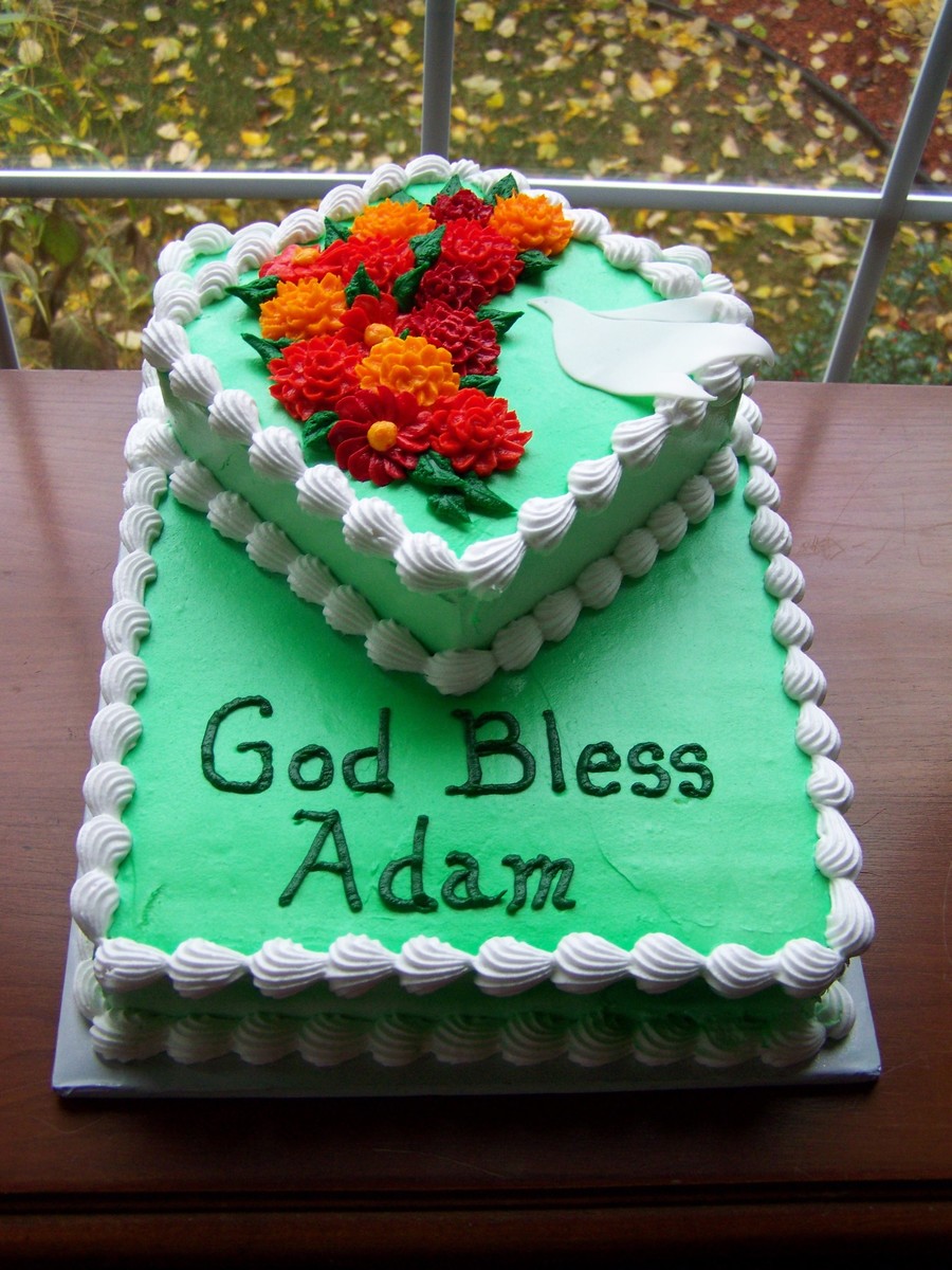 Confirmation cake with buttercream icing and flowers. Dove is made from gum paste/fondant blend.