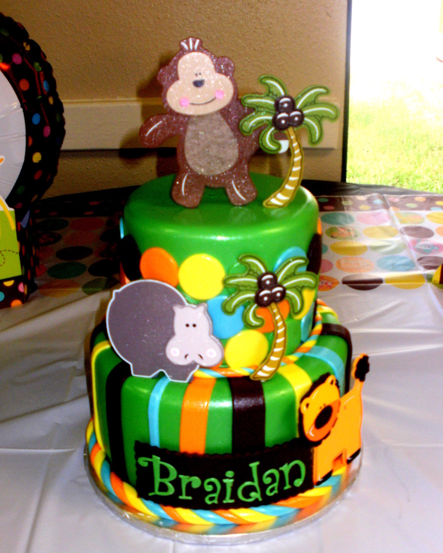 Cake for my niece for her babyshower. Made to mach the Fisher Price Rainforest animals baby shower theme. Original design from someone here on CC, Ill look and post that later to give credit for the design. The characters are wooden, she wanted to save them so I just purchased them from Micheals. 6 and 8 in rounds.