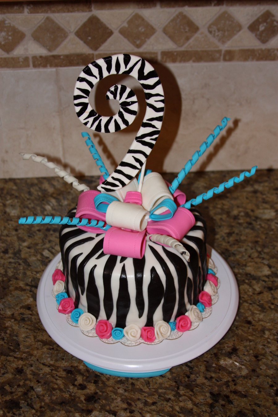 Zebra birthday cake. The #9 was made with gum paste as was the bow and curly q's.