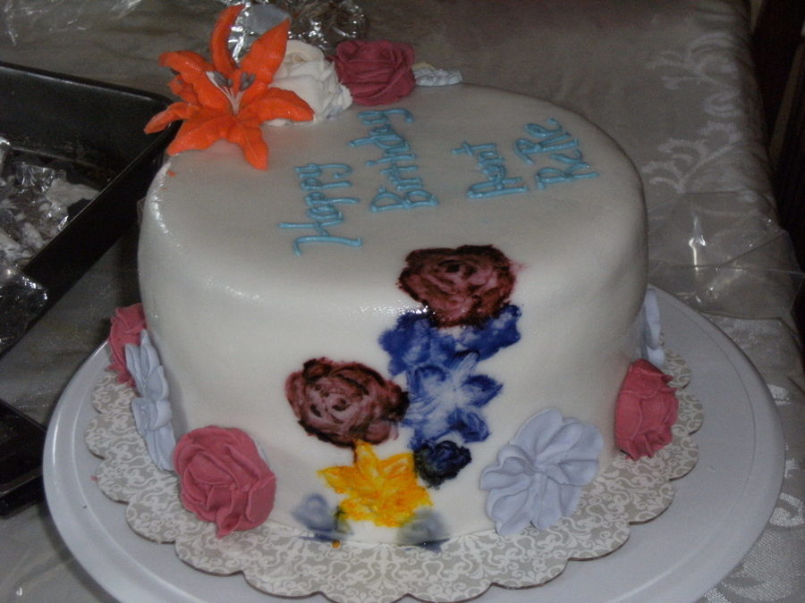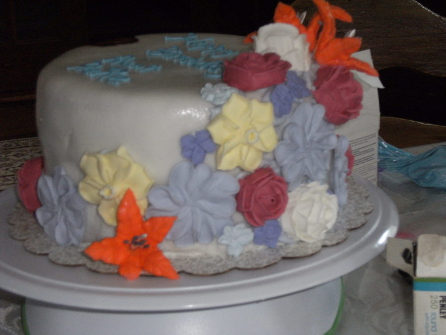 Covered in fondant with royal icing flowers. I used piping gel with the colors but it wouldn't dry. Any suggestions would be helpful.TFL