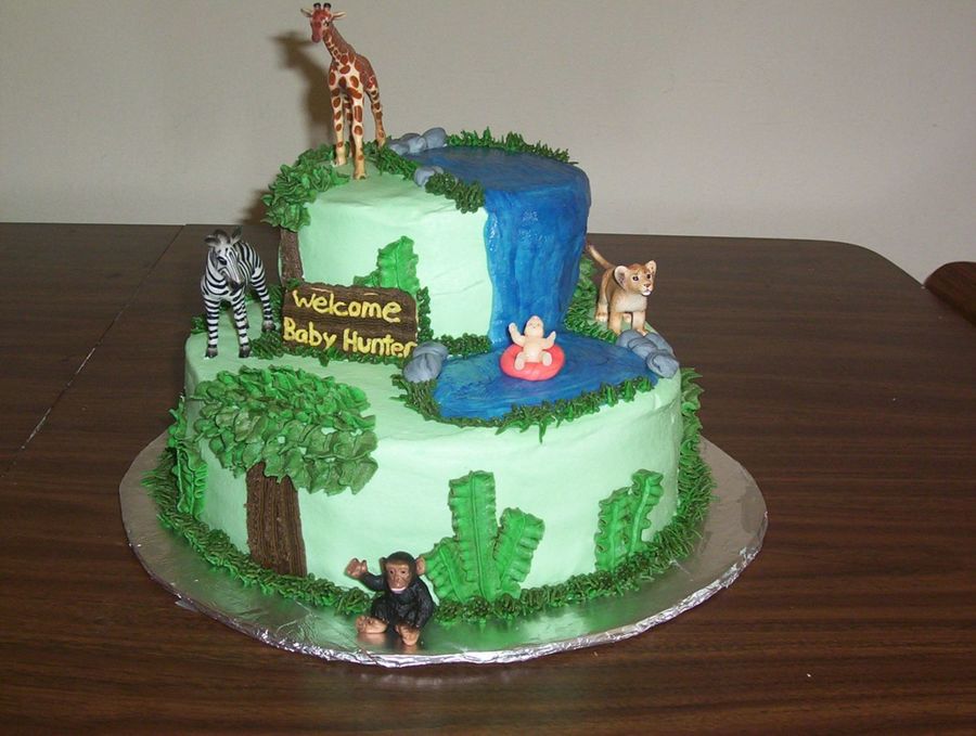 I made this for a friend that was having a jungle themed baby shower. Thanks to cindycakes2 for the inspiration. Everything is buttercream icing except for the fondant rocks beside the water and the figurines. I brushed blue tinted piping get over the water to give it that wet look.