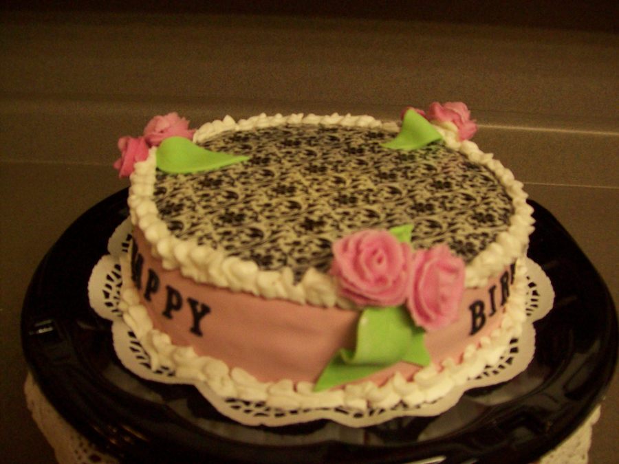 my first attempt at a choicolate transfer sheet with fondont around the cake and butter cream roses