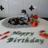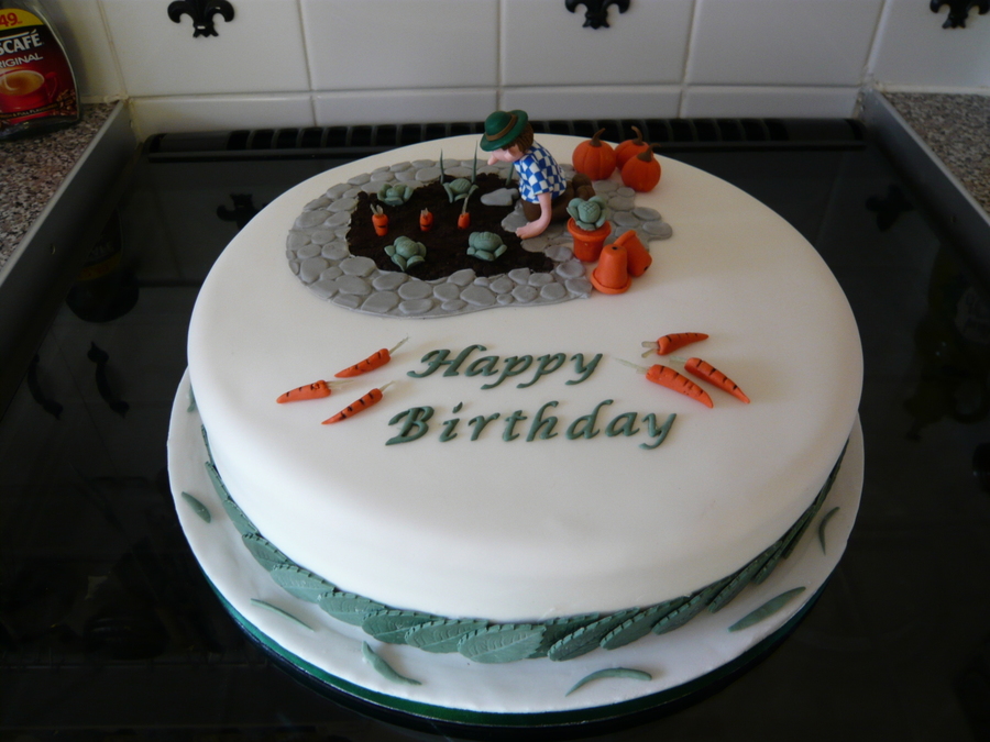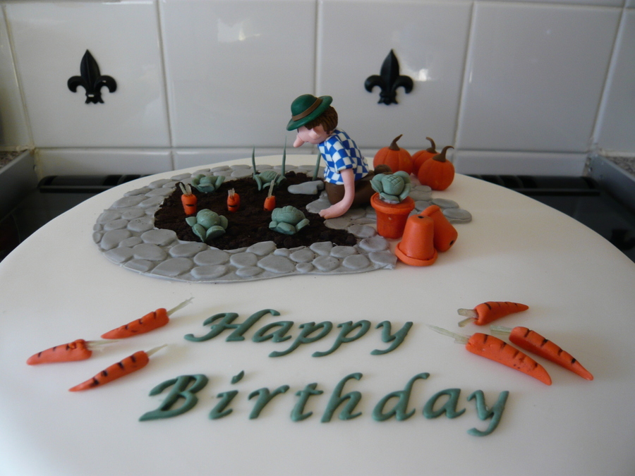 A birthday cake i made for a friend, sponge cake with claydough man, all vegetables are fondant,