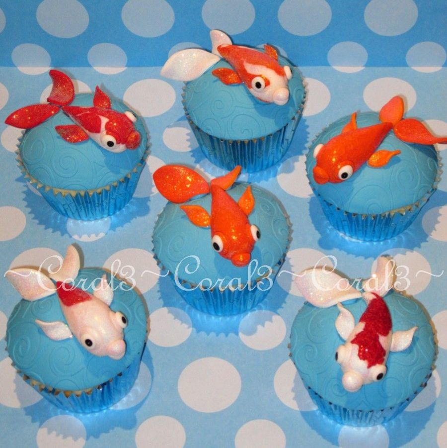 White chocolate & raspberry mud cakes with white chocolate ganache & fondant icing. Goldfish made out of fondant with gum tragacanth added.