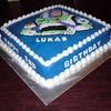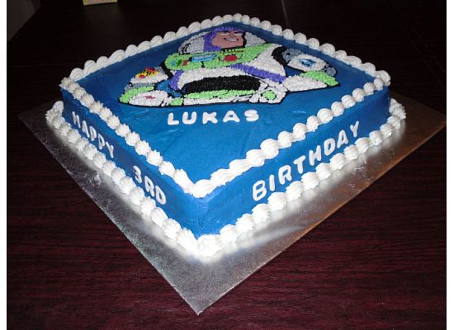 I made this cake for Lukas who loved Toy Story. It was created before the new Wilton Buzz pan was released. I used a coloring page to trace the image in the butter cream and filled in the details using butter cream and fondant..