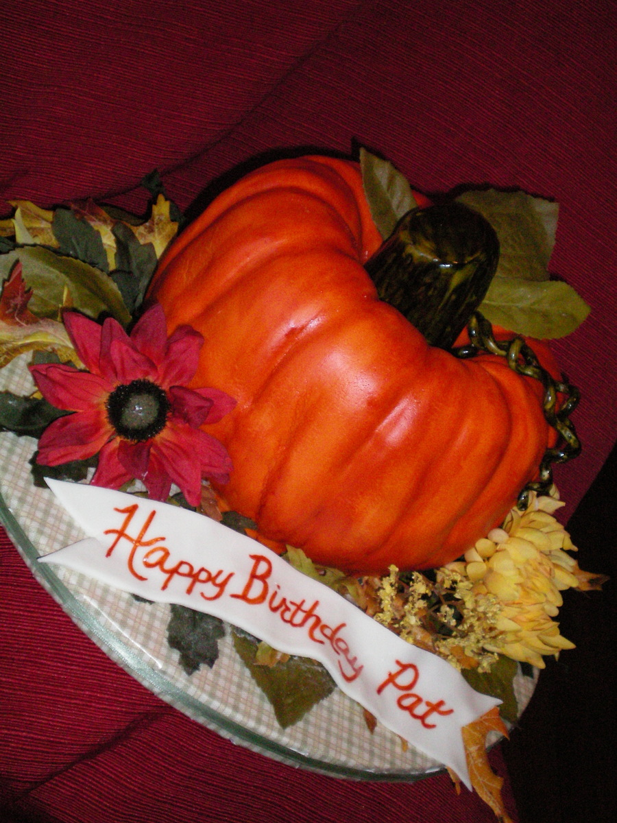 Half spice, half devil's food bundt cakes with cream cheese icing covered in mmf. Stem, tendrils, and banner in gumpaste. Silk flowers and leaves.