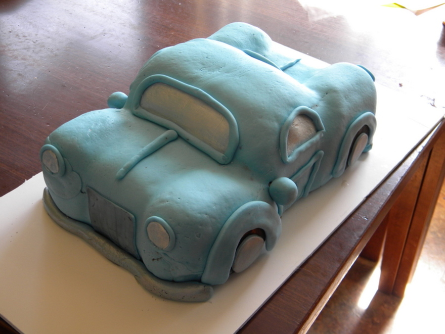 Made for a friend's son's 2nd birthday. Homemade MM fondant. Due to laziness I used a pearl dust for the in windows and mirrors of the car and silver luster dust for the trim. Not my best, fondant tore badly on one side and I didn't have time to make more.