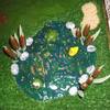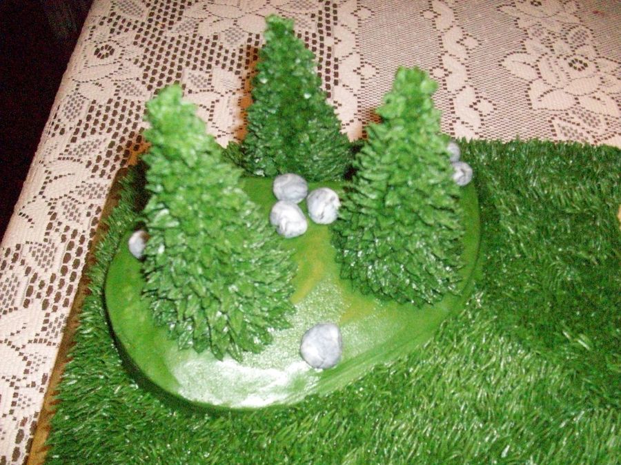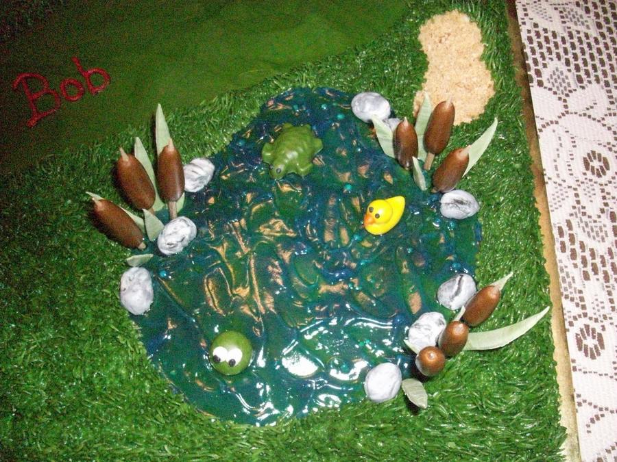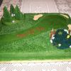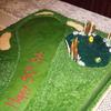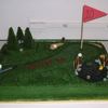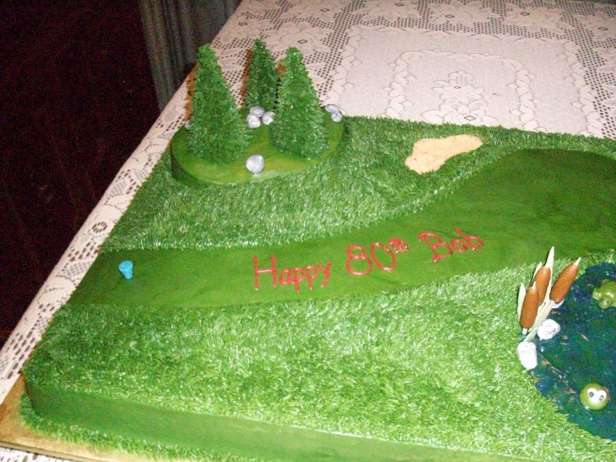 Sheet cake iced in buttercream. Sand traps were dug out and filled in with graham cracker crumbs, Pond was piping gel and cattails were made with skewers. All accent pieces were made from MMF, Smaller cake was cut to make hill for trees to set on. Tee was made from chocolate and golf balls were made from MMF rolled in white nonpareils. Golf club was a lollipop stick covered in MMF.