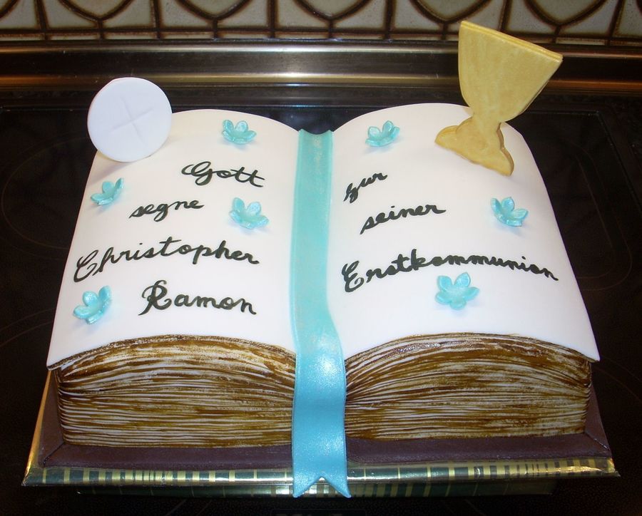 for a boy's first holy communion. he saw a photo of a bible cake from here on cc with a chalice on top -- really lovely, which i of course could not possibly recreate (because it's beyond my powers :) ). i followed tips on how to make a book cake without the book pan from researching on the forums. the only thing i didn't figure out in advance was how the cake was going to be too thick since i used a small cake pan. but the kid loved it nevertheless and hugged me while thanking me for it! totally made getting cross-eyed while painting the page "lines" along the sides worth it! :)