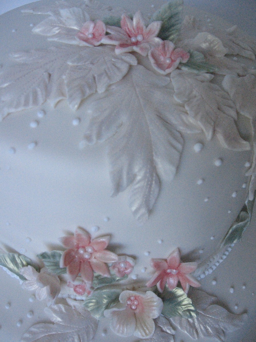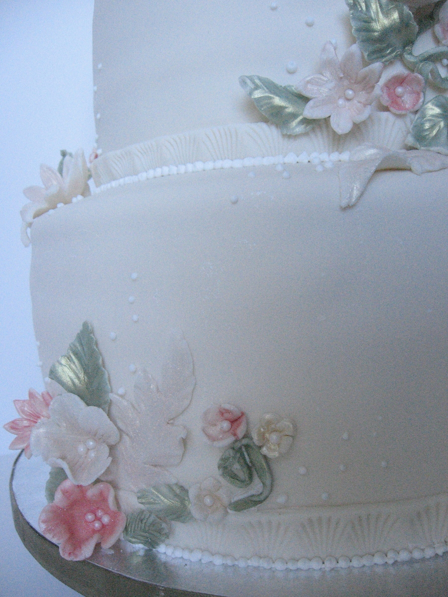Two tiers of dark chocolate layers filled with hazelnut mousse and covered with vanilla buttercream and ivory fondant. Decorations are ivory fondant dusted with pearled petal dust in avocado, antique silk and rose.