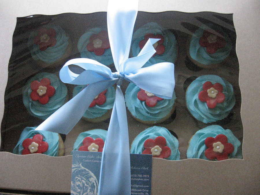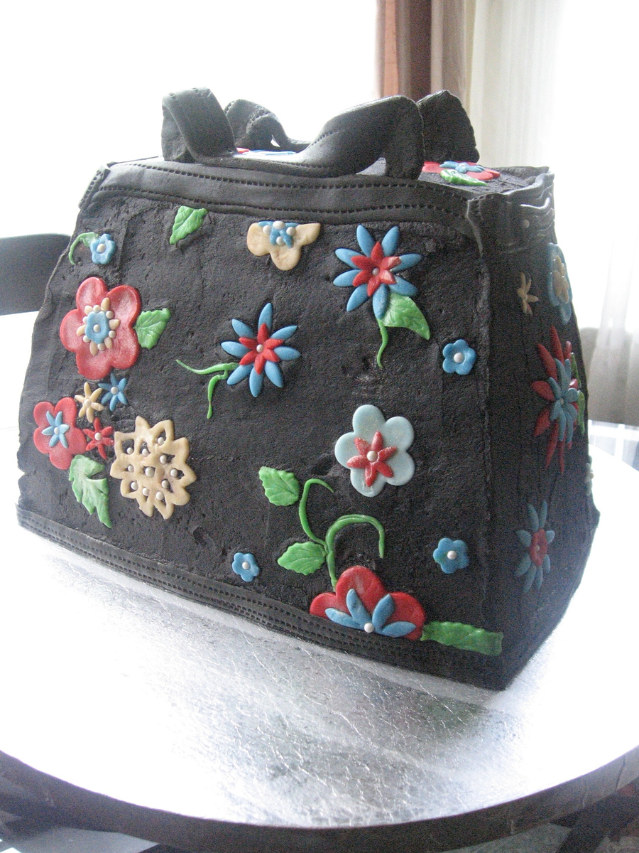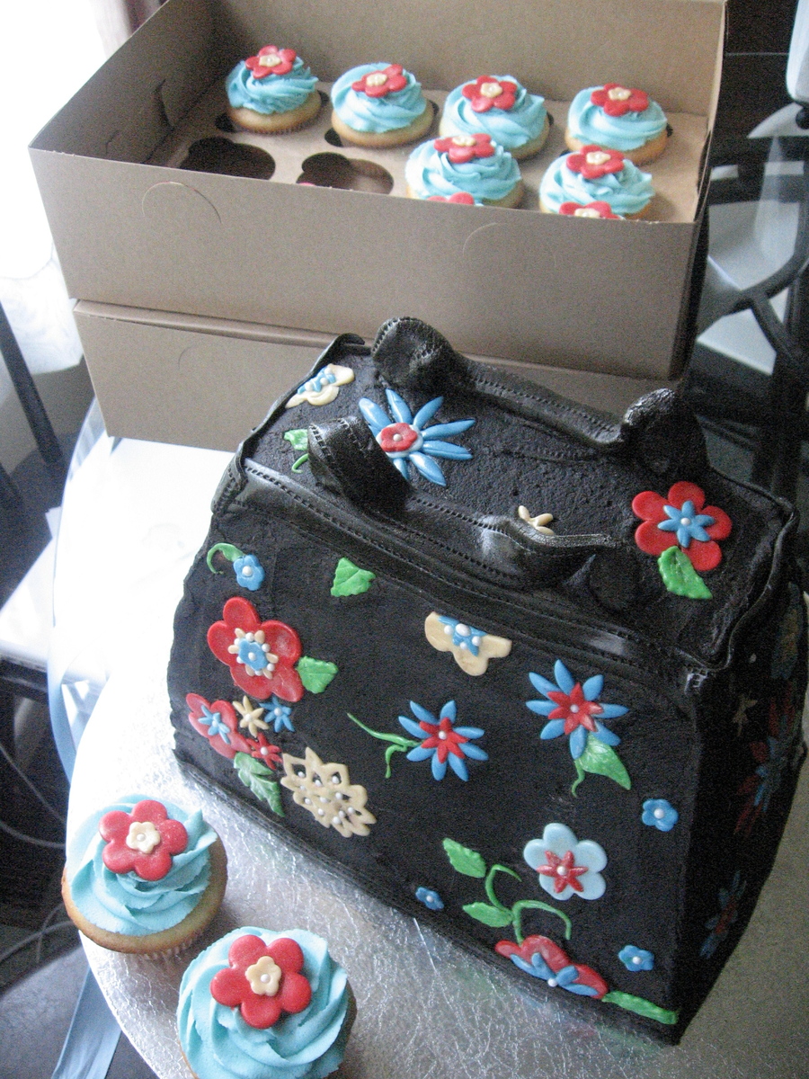White cake layers, filled with vanilla buttercream and carved to purse shape. Brown buttercream (because the client doesn't like and fondant and "brown" because she didn't like chocolate :) ) and fondant accents. We also made cupcakes with a complimentary color scheme.