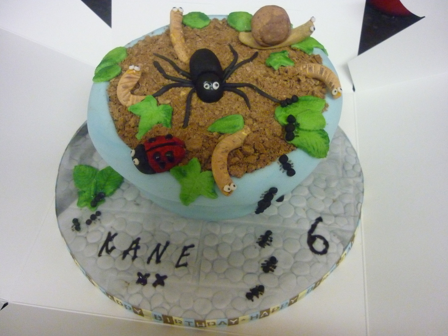 my nephew is obssessed with collecting bugs so i did this cake for him. everything is made of fondant except mud which is chocalate flake yum yum!