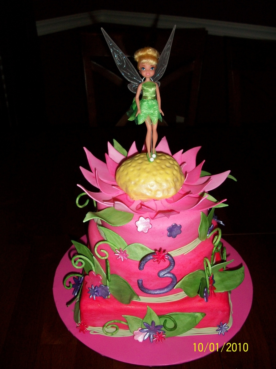 I was aked to make a Tinkerbell cake. The Tinkerbell figure is plastic, everthing else is edible
