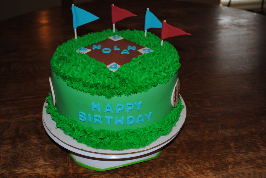 Fondant covered cake with green icing on top for the grass. Gumpaste decorations.