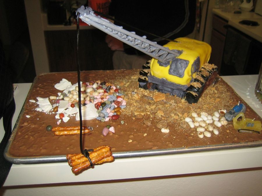 My great nephew is turning 2 and LOVES cranes, as well as dump trucks, bulldozers, etc. But, I HAD to make him a crane. The arm is 3 dowel rods covered with royal icing. Cable is shoestring licorice; "logs" are pretzel rods, wheels/tracks are chocolate biscotti, covered with fondant, and licorice pieces. It was VERY fun and quick to make!!
