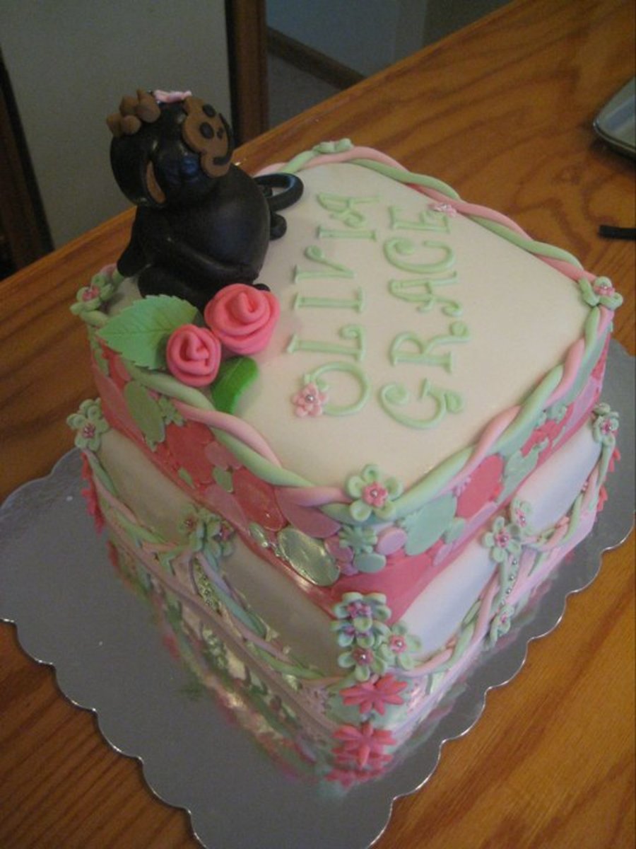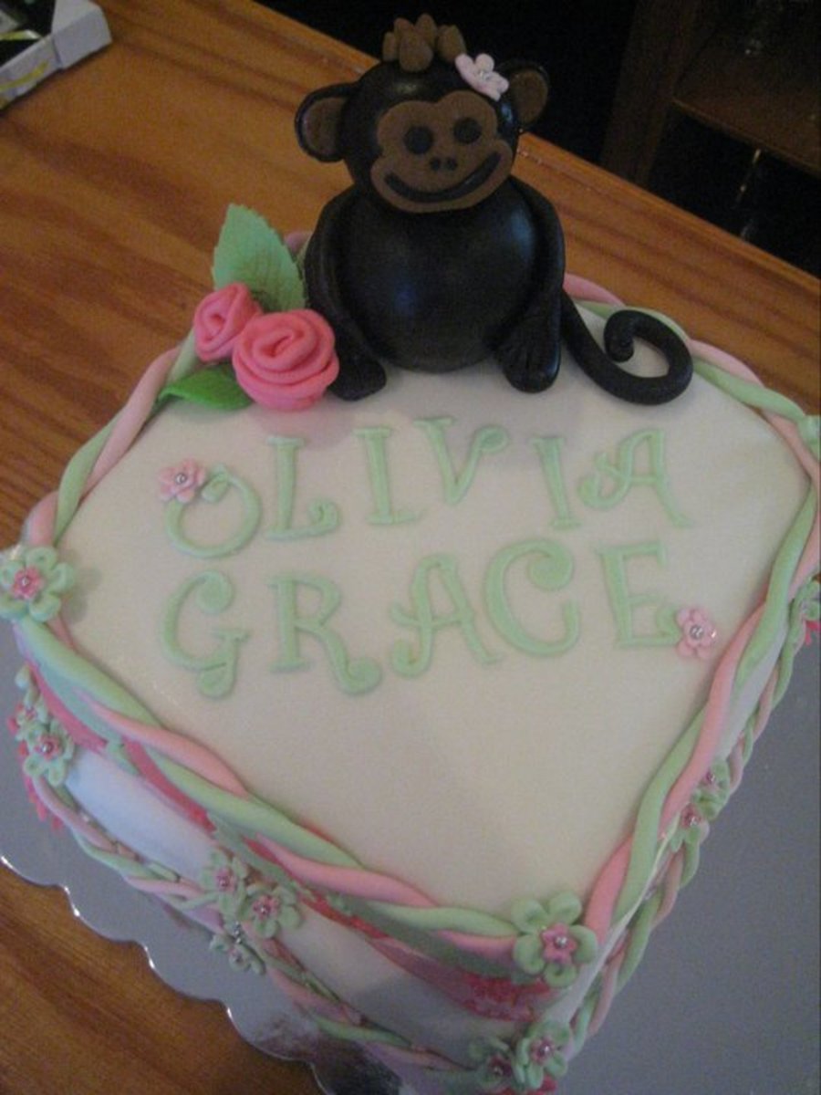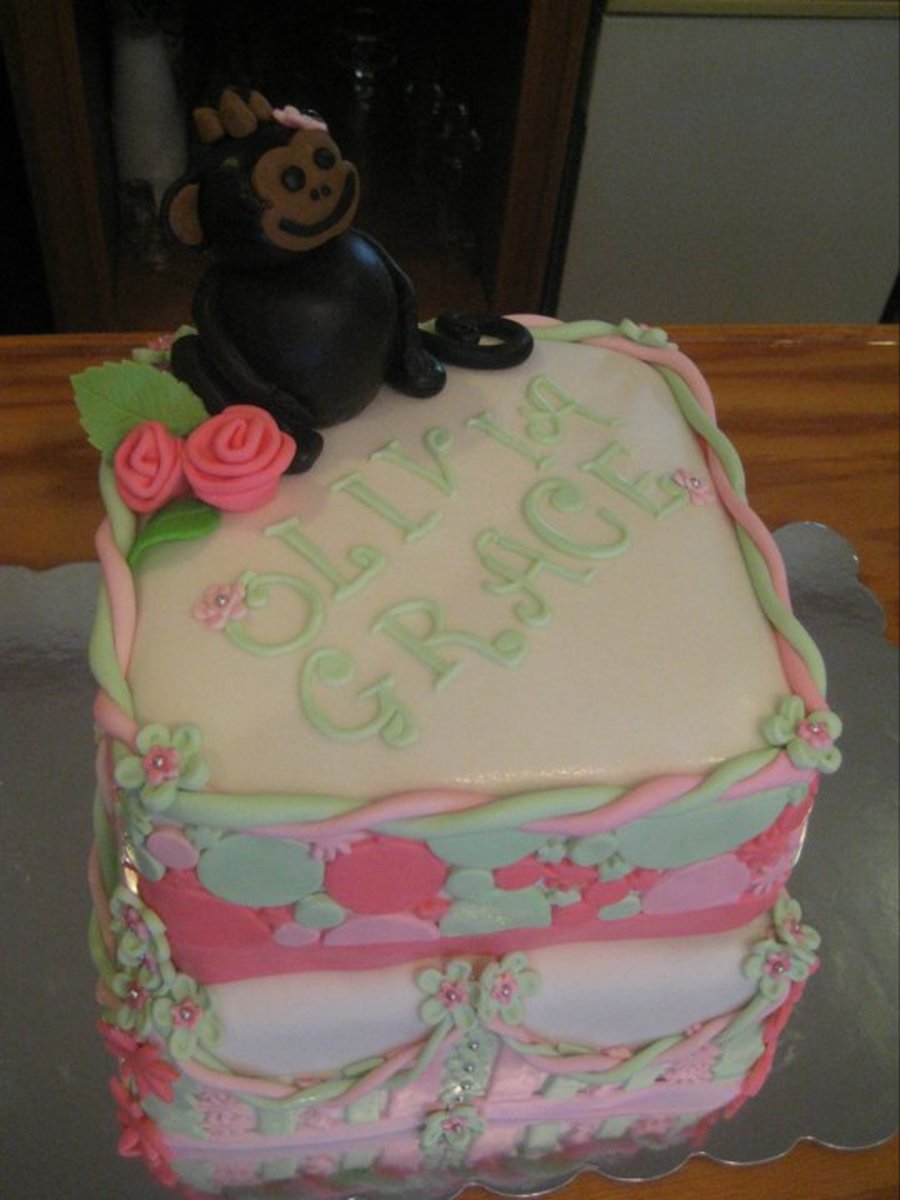 Made for my girlfriends baby shower. Two tiers bottom is 10x10 top 8x8. Top layer is hawaiian wedding with pinneapple filling creame cheese frosting. Bottom layer chocolate chip with choc cream chees frosting and choco shipps bet layers too ! (in case enuf not in the cake ..lol. Last minute (like 4 days ahead of time) so I turned to wilton for inspiration. Was gonna make baby block cake, but I felt it wasnt enought and I couldnt find those stupid balls at any local store ! (wanted to make monkeys holding top layer up!) So I turned to CC and looked at green and I found a wonderful cake and I used theirs for inspiration> if anyone knows who the original was please give them, credit, I cant find their pic now ! The monkey is covered in choco fondant (smells like tootsie rolls) Thanks for looking and thank you cake Central user ! You guys are the best ! (ps the only reguest I had to go by were green, and a monley and maybe her name since she was already born)