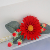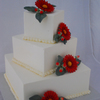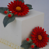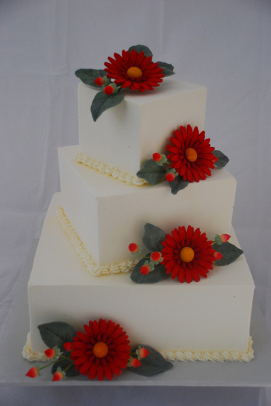 This is a 3 tier square Italian Meringue Buttercream wedding cake decorated with hand-made gum paste gerbera daisies, hypericum berries and leaves. The cake is a Dark Chocolate Devil's Food cake with Seedless Raspberry Jam and Vanilla Italian Buttercream. It is covered in Vanilla IMBC.