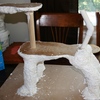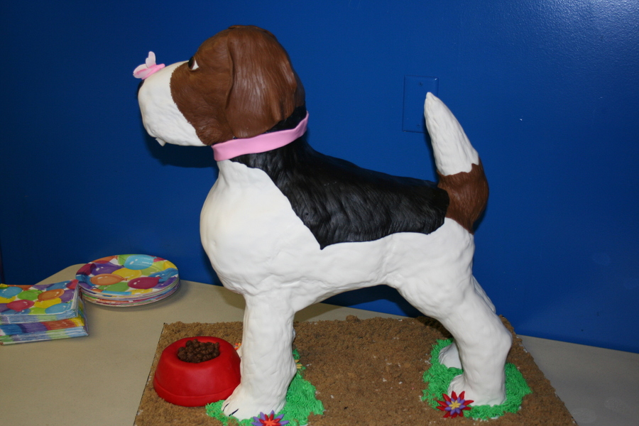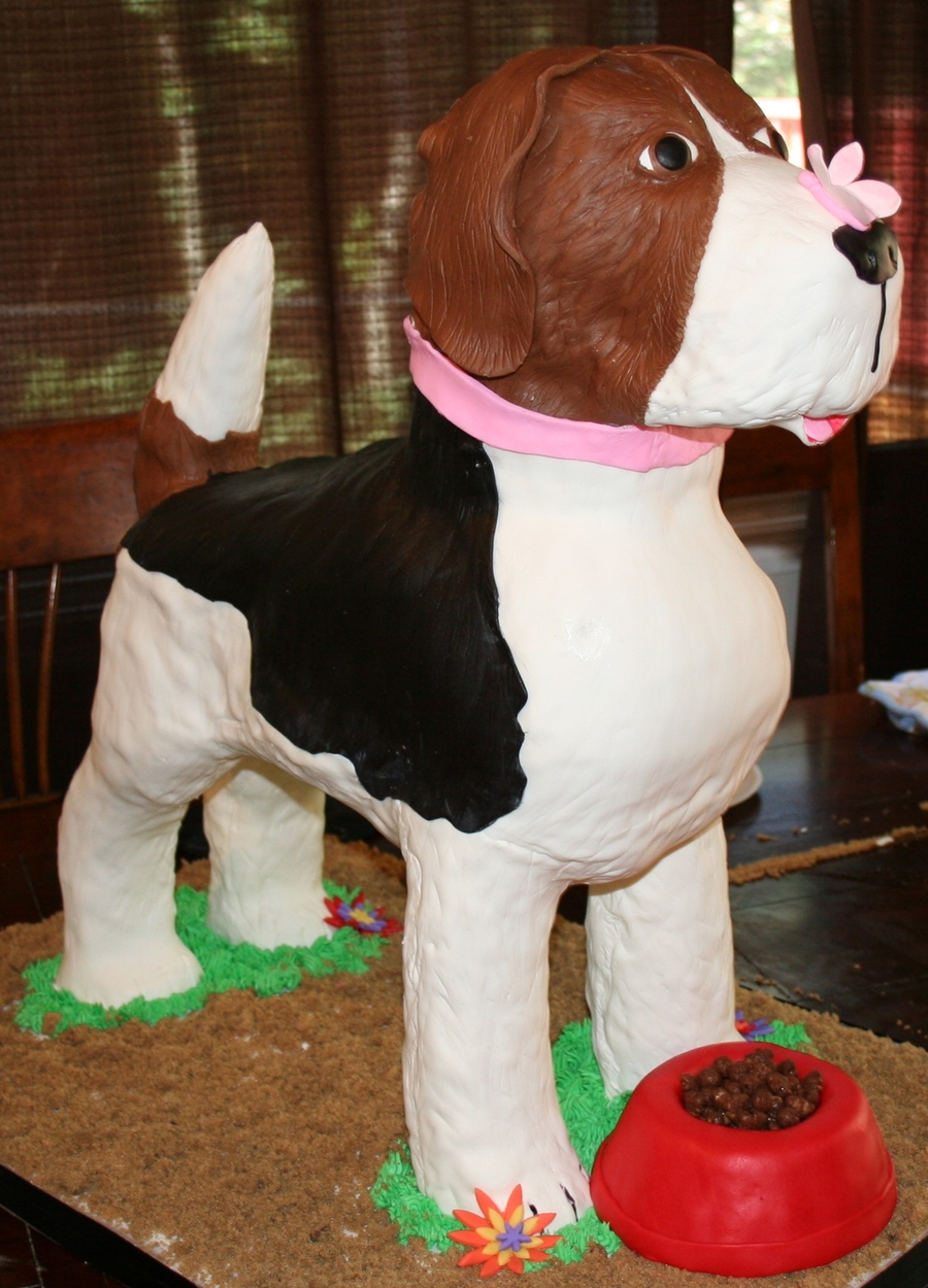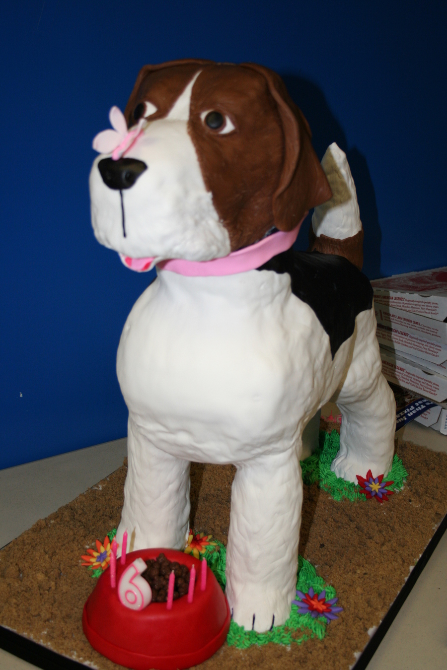 Littel girl LOVES beagles, and wanted a cake to reflect that! This cake wound up being one of the most challenging/fun cakes! Strawberry cake with strawberry filling and vanilla buttercream frosting. Covered in fondant. Dog bowl was small cake covered in fondant, then filled with chocolate puff cereal. Dog base/stand was made from wood and PVC pipe. Legs, tail, and underbody were made from RKT, then covered in royal icing.