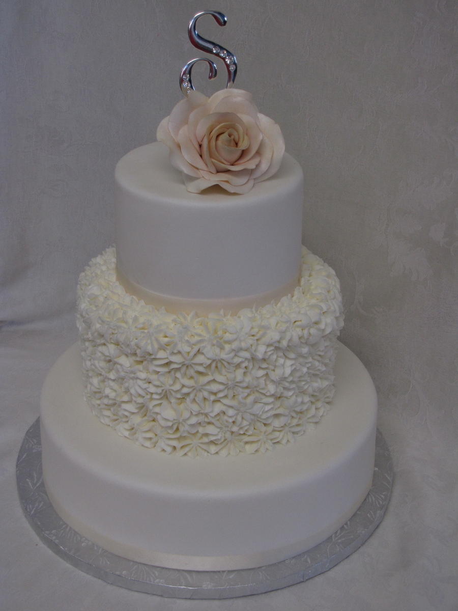 3 tier 6, 8, 10, the 10" is 3" tall. Designed for a wedding show. Middle tier is decorated using the cupcake tip. Gumpaste Rose.