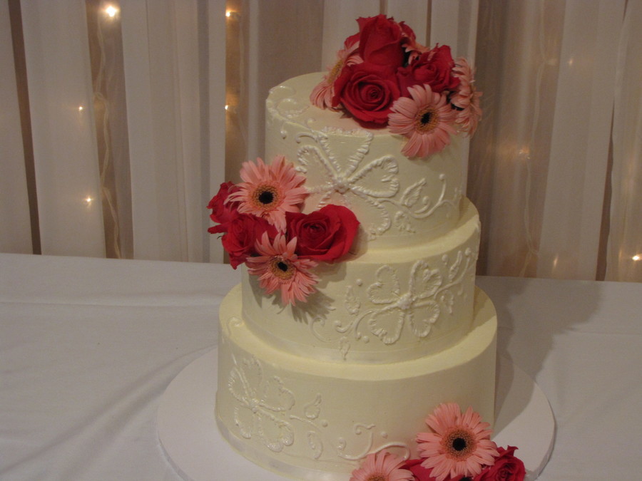 IMBC with buttercream brush embroidery. Satin ribbon around the bottom of each tier. Real flowers. The bride's wedding theme was Country Chic. I think she did a good job picking it out!