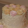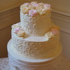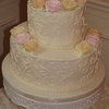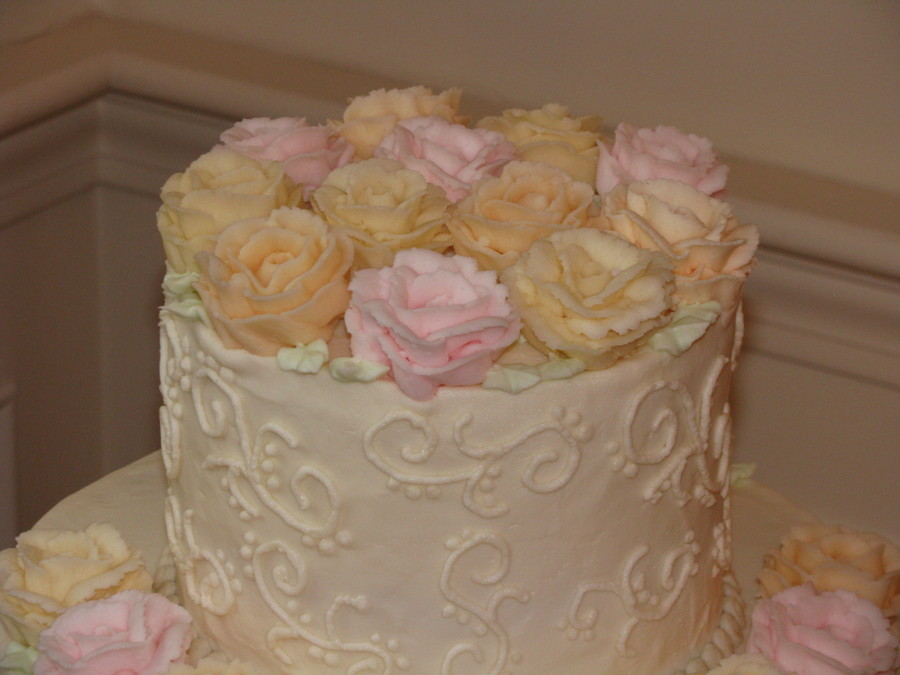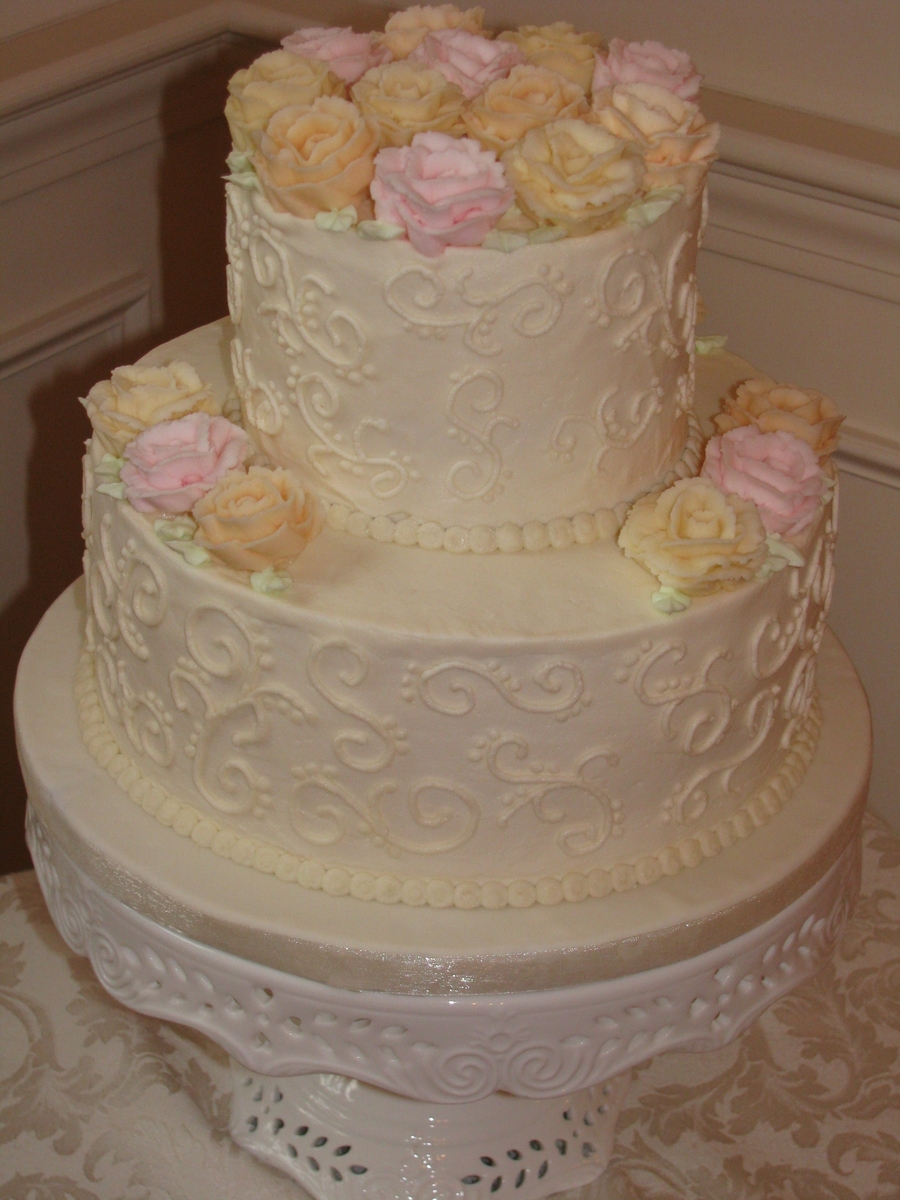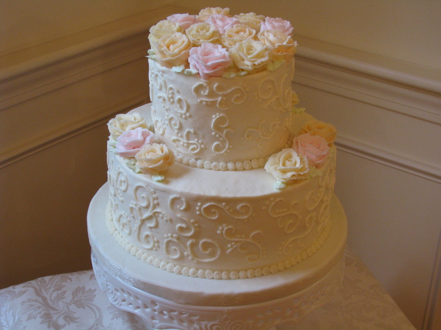 10" and 6" tiers, both vanilla cake with buttercream icing, scroll work and roses.