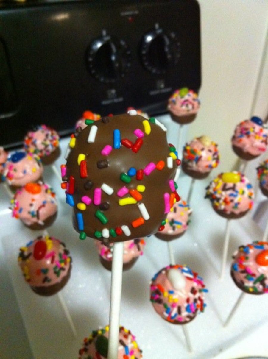 My first time making cake pops. Thanks Bakerella! Yellow cake with cream cheese frosting. Chocolate coating and sprinkles. Thanks for looking.