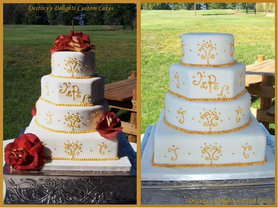 This was a wedding cake I did for 10-10-10, Cake is covered in fondant, with fondant scroll work painted with gold glaze. Thanks for looking!