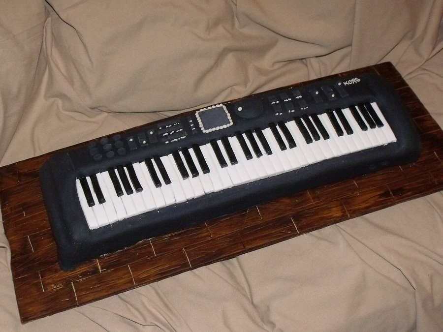 This cake was created for a keyboard-playing aficionado. The cake was very detailed and time consuming. I covered the base in fondant and wood-grained it (one of my favorite techniques). Hope you like!