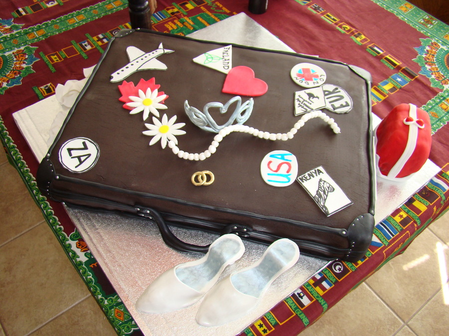Suitcase cake for someone going to South Africa to get married, hence the shoes, rings, small purse on the side and the wedding rings.