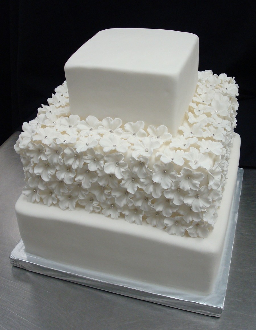 this is a 3 tier square i made. i love how the middle tier turned out! couldnt stop staring at the flowers! the cherry blossoms were made from a press mold and added silver dragees in the center for elegance.