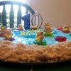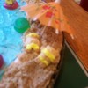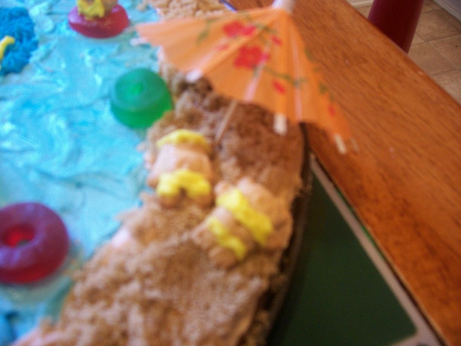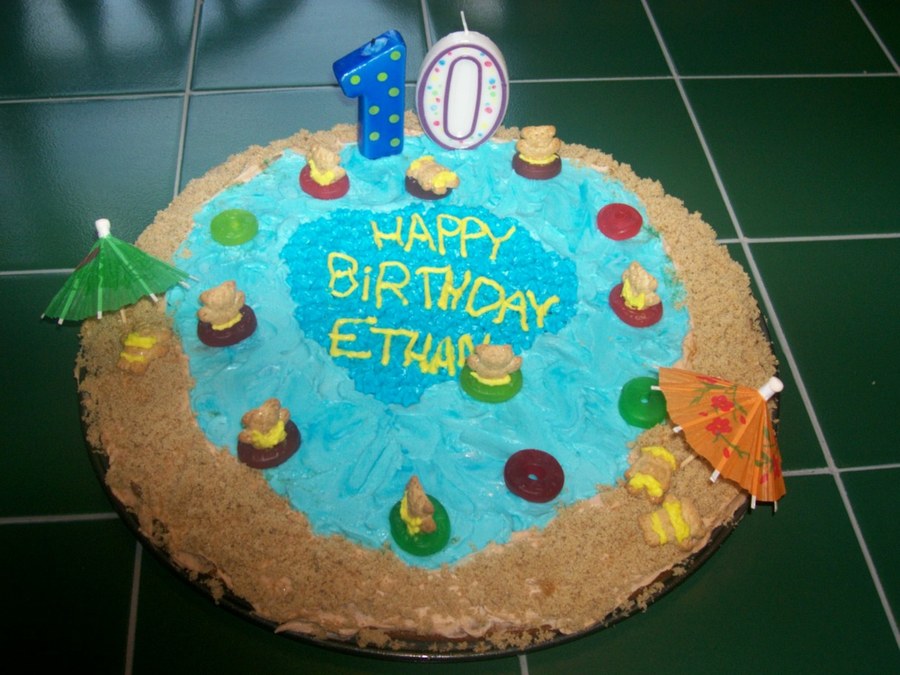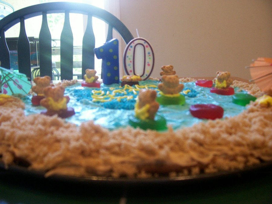 This is a cake i did for my brothers 10th birthday. It's a cookie cake. For the water, I used light blue frosting mixed with clear, and dark blue piping gel to give it a wet effect. For the sand i used brown frosting with brown sugar for sand. Teddy Grams in gummy Life Savers candies ( for more detail, i used frosting and piped bikinis and sunglasses on some of the Teddy Grams) In the inside i put dark blue frosting with "happy birthday" on it. This is a very easy, fun cake to make that will empress lots! I also used drink umbrellas on the sand and put Teddy Grams under them like their sun bathing.
