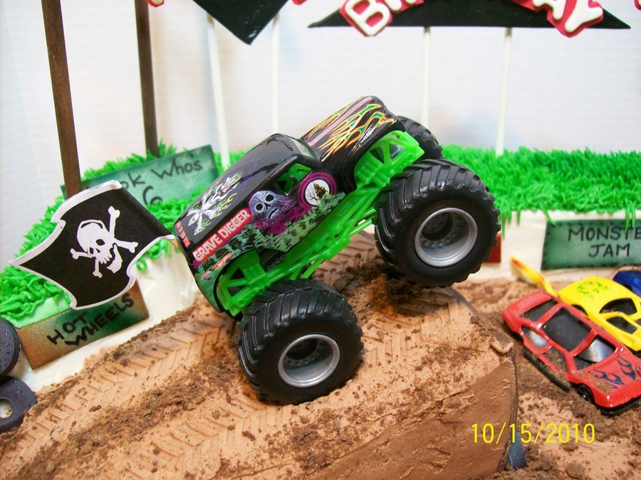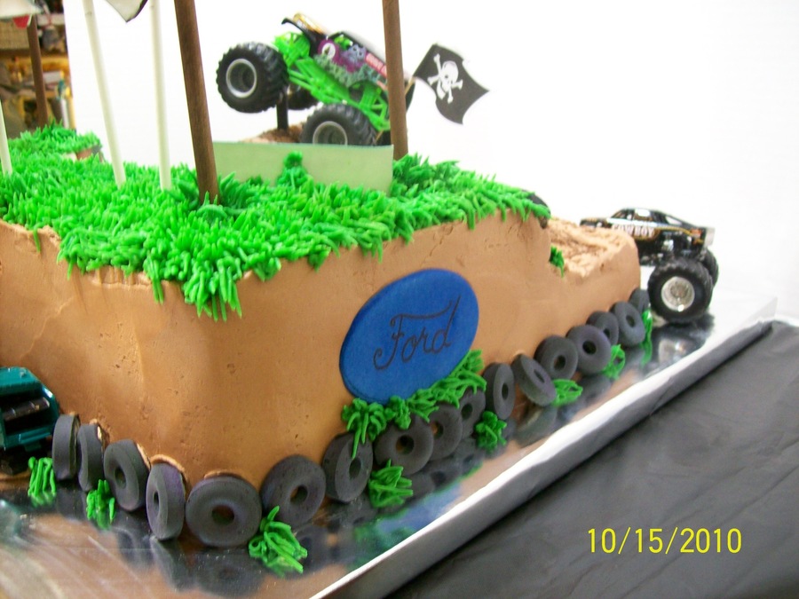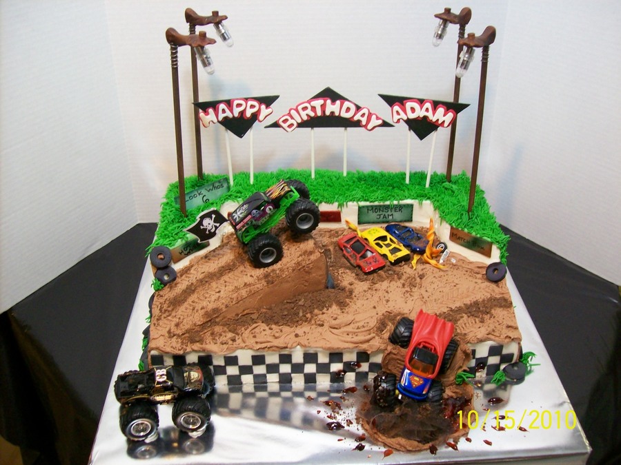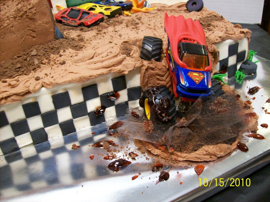 Chocolate cake w/ BC icing and fondant/gumpaste accents. Carved the arena from cake. LED 'pole lights' actually work! The toy trucks were provided by the Mom (a co-worker) who got the cake for her 6 yr. old. (she actually smashed up the jumper cars for effect:) - very cool idea, I thought! Dirt is crushed chocolate graham crackers and mud is piping gel. Thanks to CC friends who helped with the 'flying dirt' ideas - I used...yep, that's tulle on a monster truck cake:) TFL!!