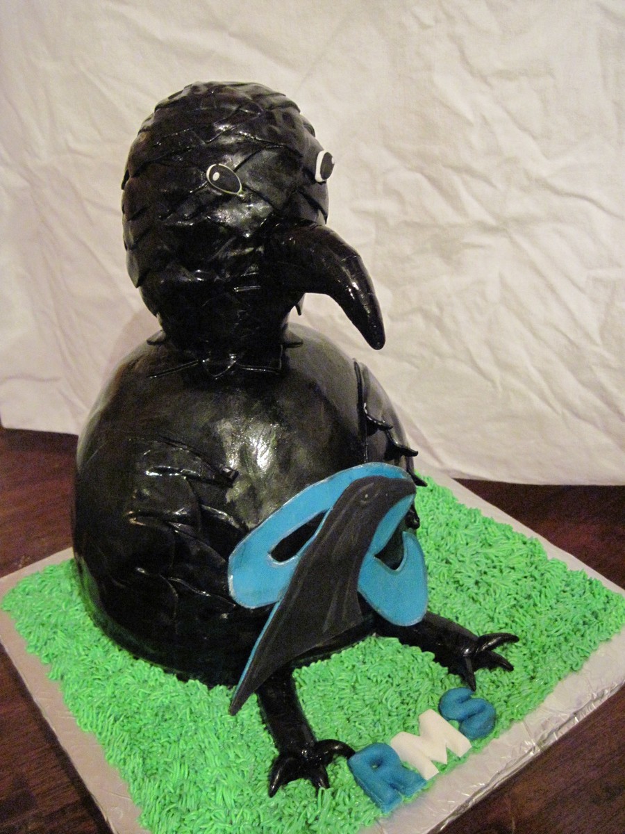 My sister in law works at a middle school whose mascot is a raven. She wanted a 3d cake to take for bosses day. It isn't very easy to make an all black animal look interesting. Used the bake and fill pan with an 8 in round in the middle. Styrofoam egg was used for head. Logo and all other deco is fondant. Handpainted the bird black.