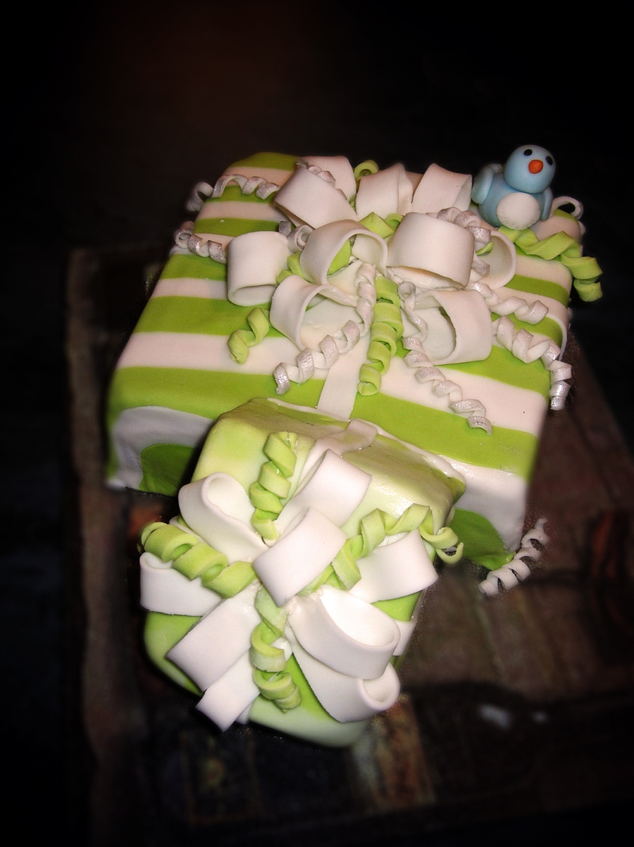 This cake was one of my first fondant cakes for my friends bridal shower. It was green striped with a little blue bird to match the wedding invitations. The cake was vanilla with lemon filling.