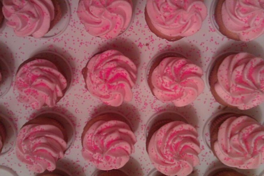 Pink Ribbon cupcakes, for breast cancer awareness month, pink lemonade, strawberry and raspberry, with raspberry buttercream frosting and pink ribbon sprinkles, pink sanding sugar and ribbons. 20% of all sales going to susan g colman fight for the cure.