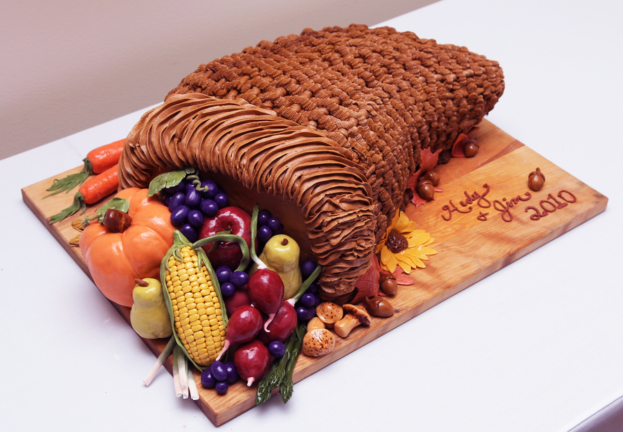 Non-traditional bride wanted a cornucopia (horn of plenty) cake. Cinnamon apple spice cake with caramel buttercream. Fruits, veggies, acorns, leaves and flower are either fondant or RKT covered in fondant. TFL!