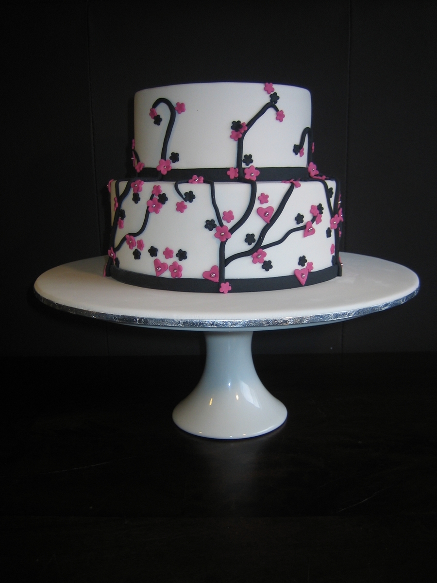 Vanilla sourcream cake with dark chocolate ganache and fondant. Vines, flowers, hearts and cachous. For a small, country wedding