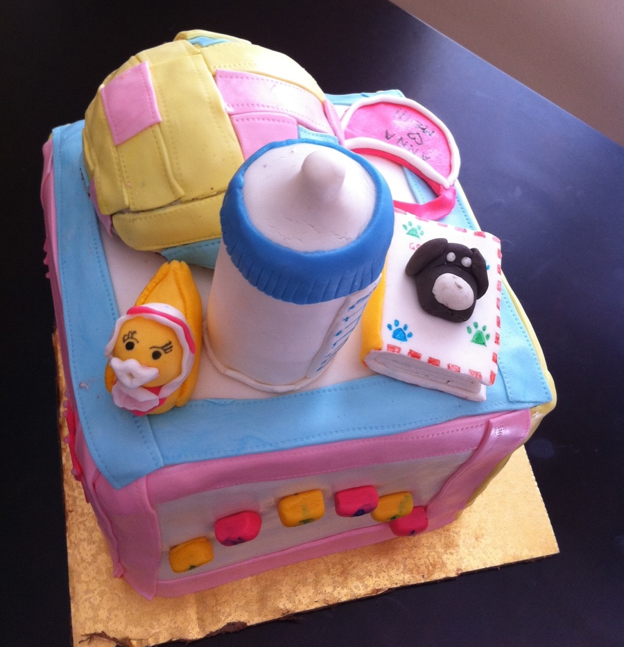 The design of the cake was a baby block with a small patch ball on the top. Also , on top are some of her favorite things : her dr. brown bottle , "good puppy" book , a rubber ducky ( just my addition! ) and a bib that says " Anna ( Older brother ) loves me" !!!...which is your favorite one? I think it's the baby bottle for me..! All the baby items were made from sugarpaste. It was a 5 layer cake with chocolate at the center with adjacent layers of yellow cake and alternate layers of strawberry cake. The filling was Strawberry mousse and Italian meringue buttercreme... all topped with orange marshmellow fondant. More pictures http://creativecakez.blogspot.com/