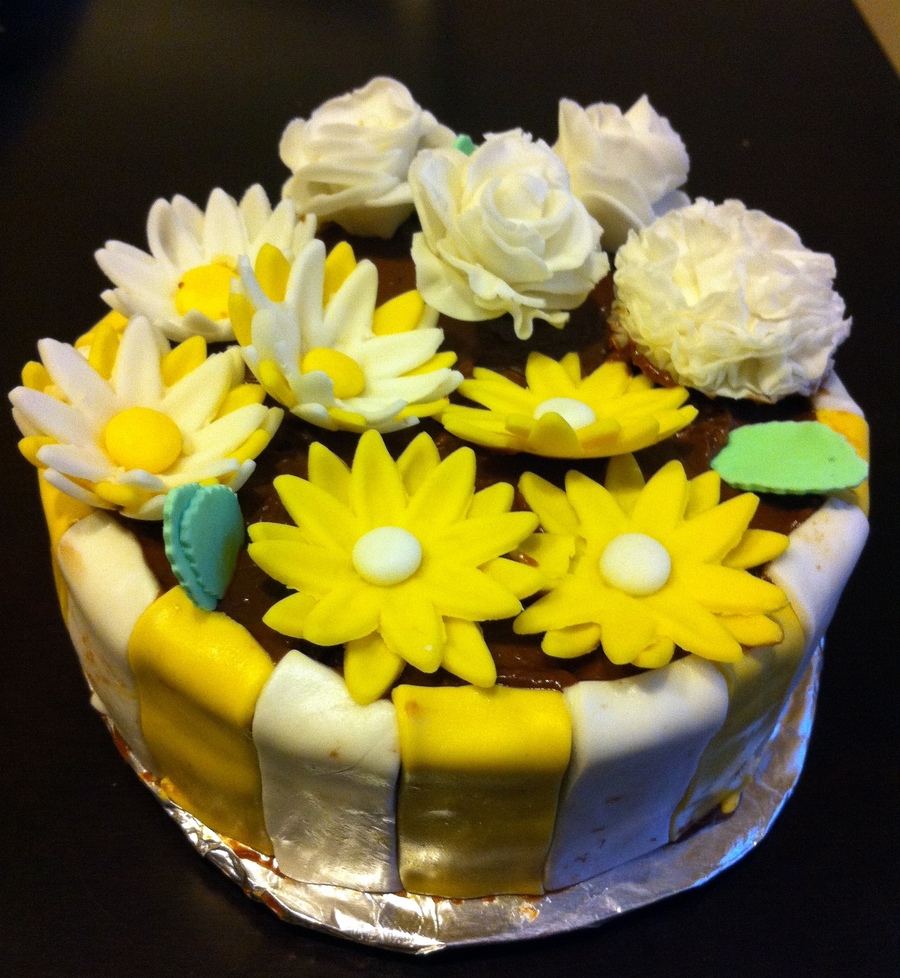 Moist Yellow cake with chocolate frosting . All the flowers are made from marshmellow fondant.