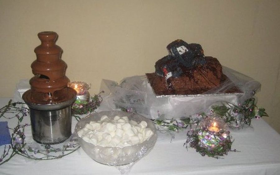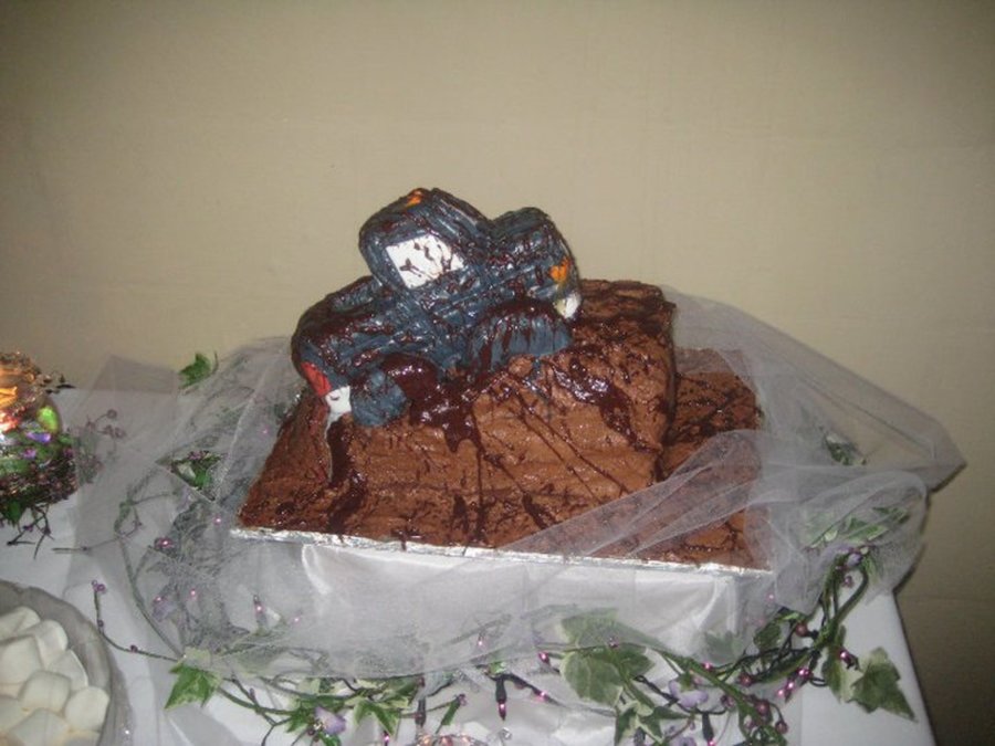 This cake was really fun to do. My son-in-law loves his truck and loves to go mudding....so, we thought that this would be appropriate for him. It is all chocolate. The truck is covered in fondant and the mud is melted chocolate whisked on by the flick of the wrist