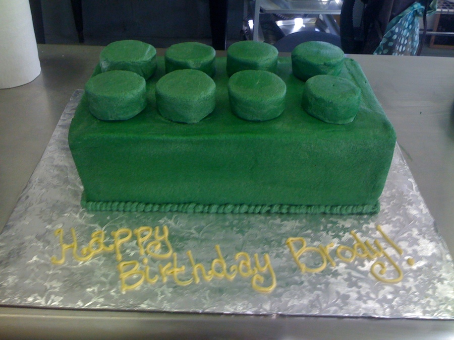 Birthday cake for a little boy. Mom said he was very particular about the Lego Brick, had to be green with 8 knobs. I got the dimensions of a real Lego brick so that way the real cake was as proportional as possible.
