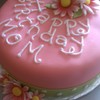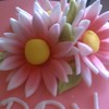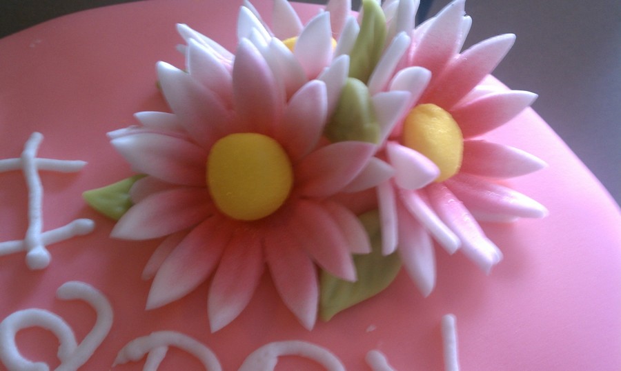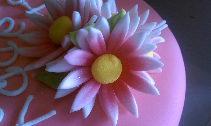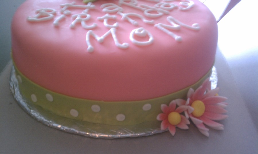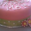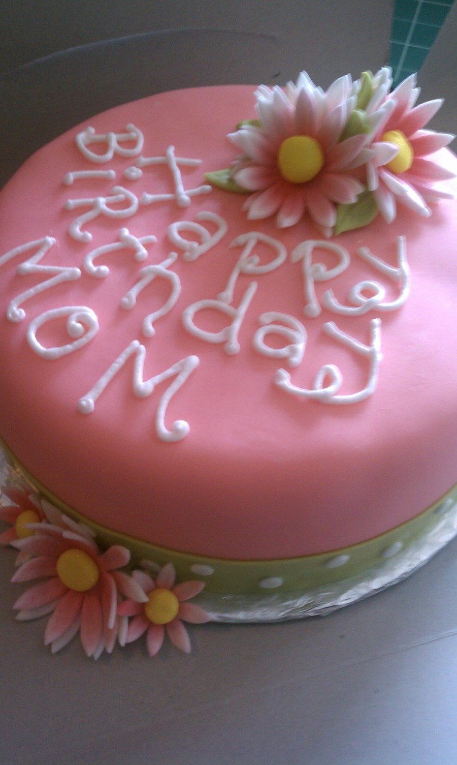 Pink fondant cake, lime green and white polka dots fondant border, fondant flowers air brushed