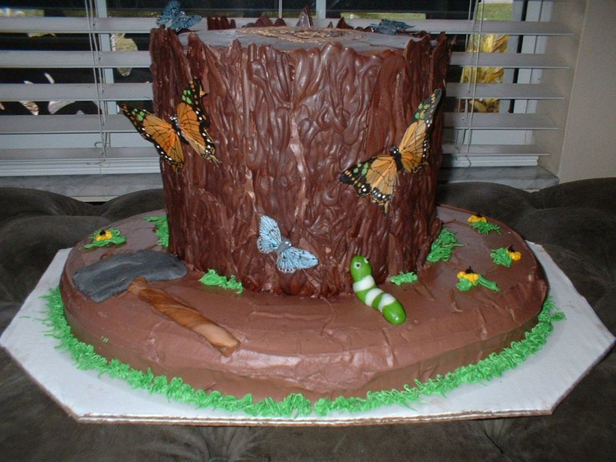 choolate stump cake for a friends daughters wedding...the bark is dark and regular chocolate meltaways... the axe and caterpillar are candy clay...I ran out of time and had to use feather butterflies that matched the brides cake.