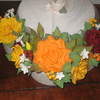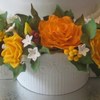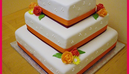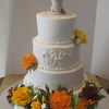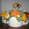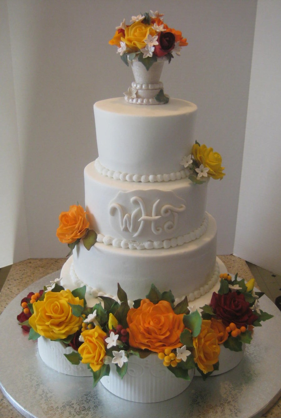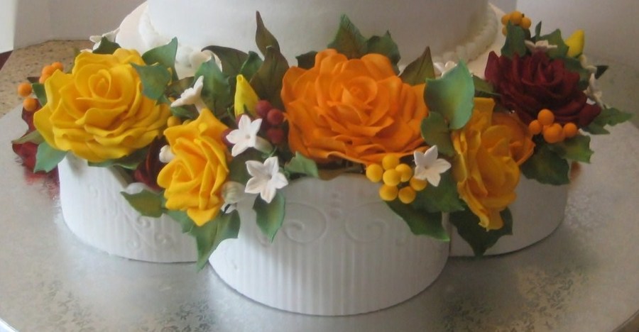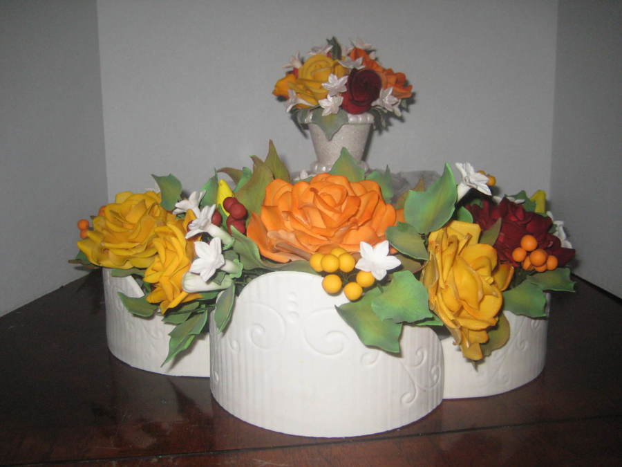I made this cake for my niece's wedding this weekend. Sizes are 12in,10in.,8in.,6in. The topper is a vase made from sugar with gumpaste roses, leaves & filler flowers. There was to be roses all around the bottom, but due to a bad reaction to a spider bite I had to change the design. I took athe JEM Fancy Oval Plaque Cutter, cut out a plaque, then took a impression mat and did the design on the plaque, cut some off the bottom, then place it on a cake dummy. Cut a second one then cut it in half and place them on sugar tubs to dry. The roses, leafs, ivy, stephanotis are made from gumpaste. Something good came out of the spider bite, I really liked this design better. TFL. God Bless Sharon