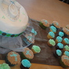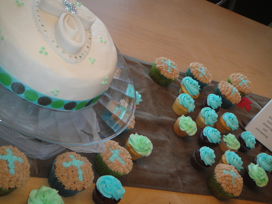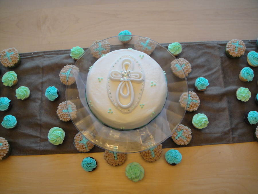 Cake is marble with raspberry filling and buttercream with fondant cross. Cupcakes are pumpkin pie with pumpkin cream cheese frosting! Amazing! And then white and chocolate mini cupcakes with buttercream. For my sons Baptism, it was so fun! Thanks for looking! I got the idea from a couple of you here on CC. Thank you!