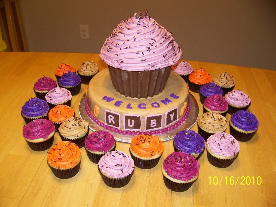 Baby shower theme: cupcakes and fall colors. Giant cupcake with a chocolate mold "wrapper" on top a 10 inch round. chocolate baby block name and chocolate feet around. and 24 regular sized cup cakes.