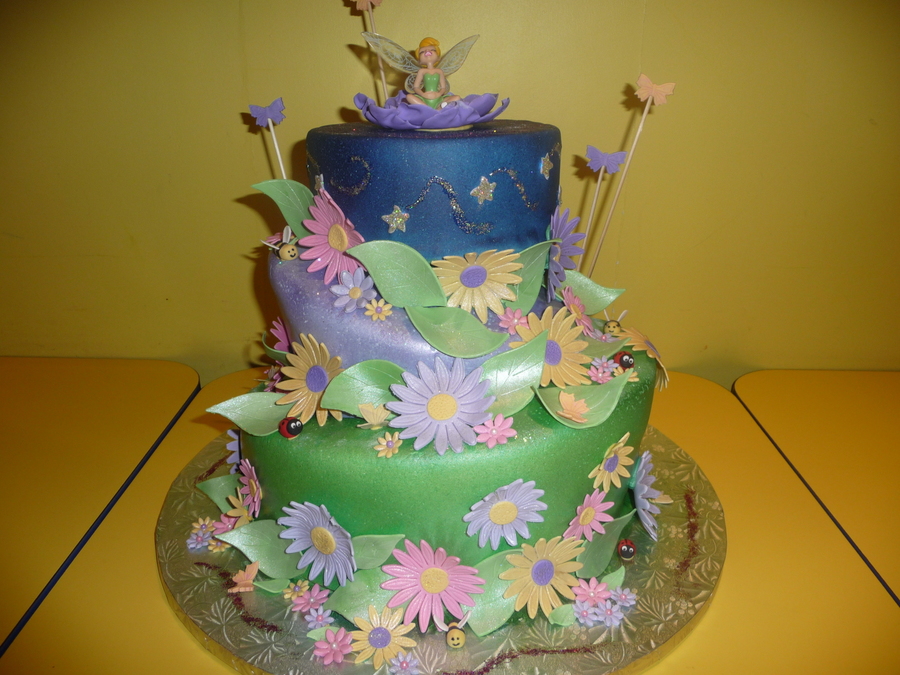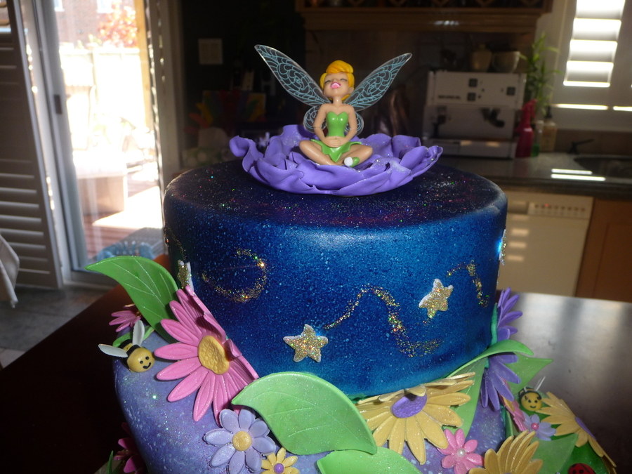 12" and 9" cake. The top teir was a 6" styrofoam piece. I inserted LED lights and the stars lit up. Stars were covered in disco dust. Gum paste flowers.
