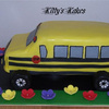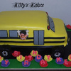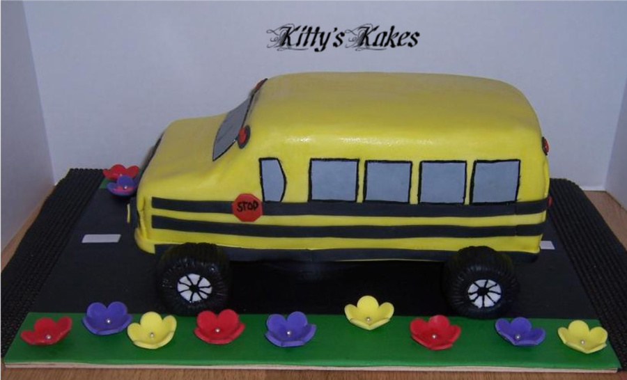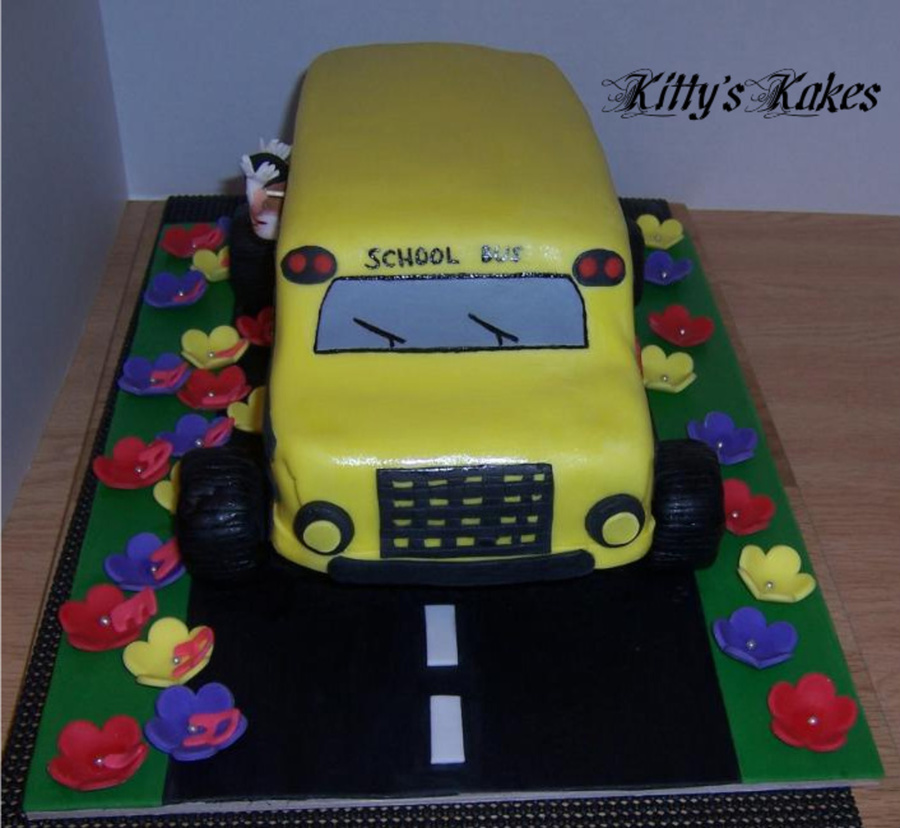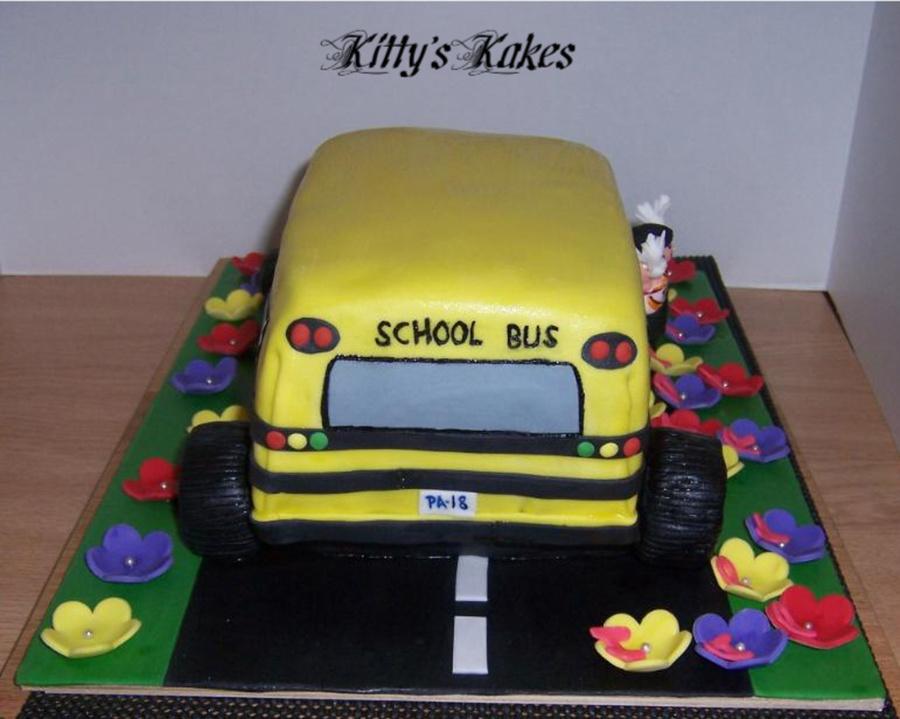 School bus with the bday girl hanging out the window with her cheerleading outfit on and a helmet...she's a "special" girl lol