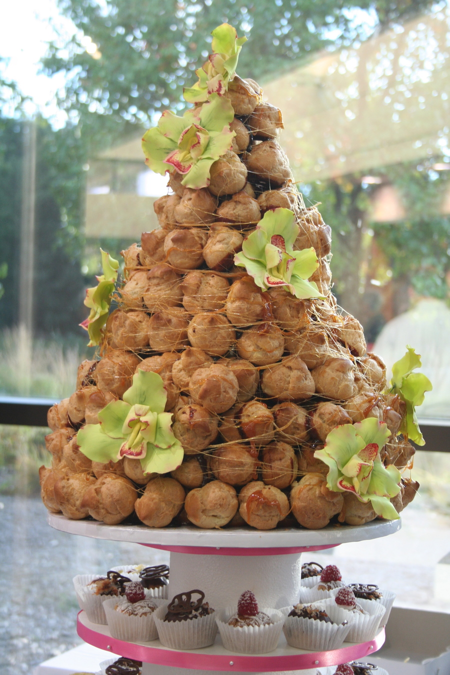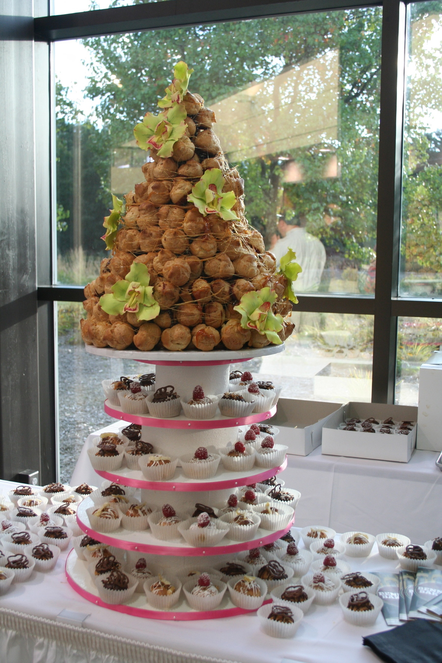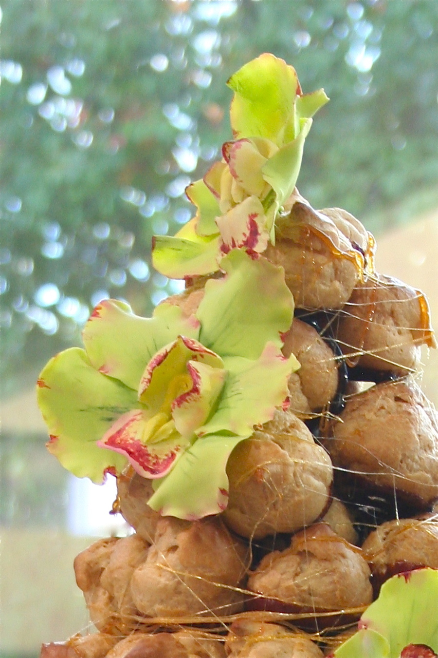 We made this croquembouche for a contest sponsored by the Girl Scouts and won "most creative." All the desserts had to be made using Girl Scout cookies as an ingredient. We used crushed shortbread cookies in the cream puff dough and other cookies mixed in the filling. The orchids are gumpaste and hand painted.