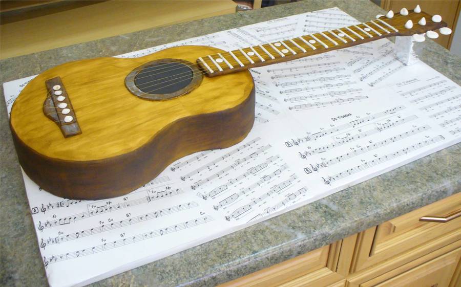 Sheet cake carved by hand with a handrawn template. Painted with food coloring. The cake board is foam core covered in printed guitar sheet music of the groom's favorite artist then covered in clear contact paper.